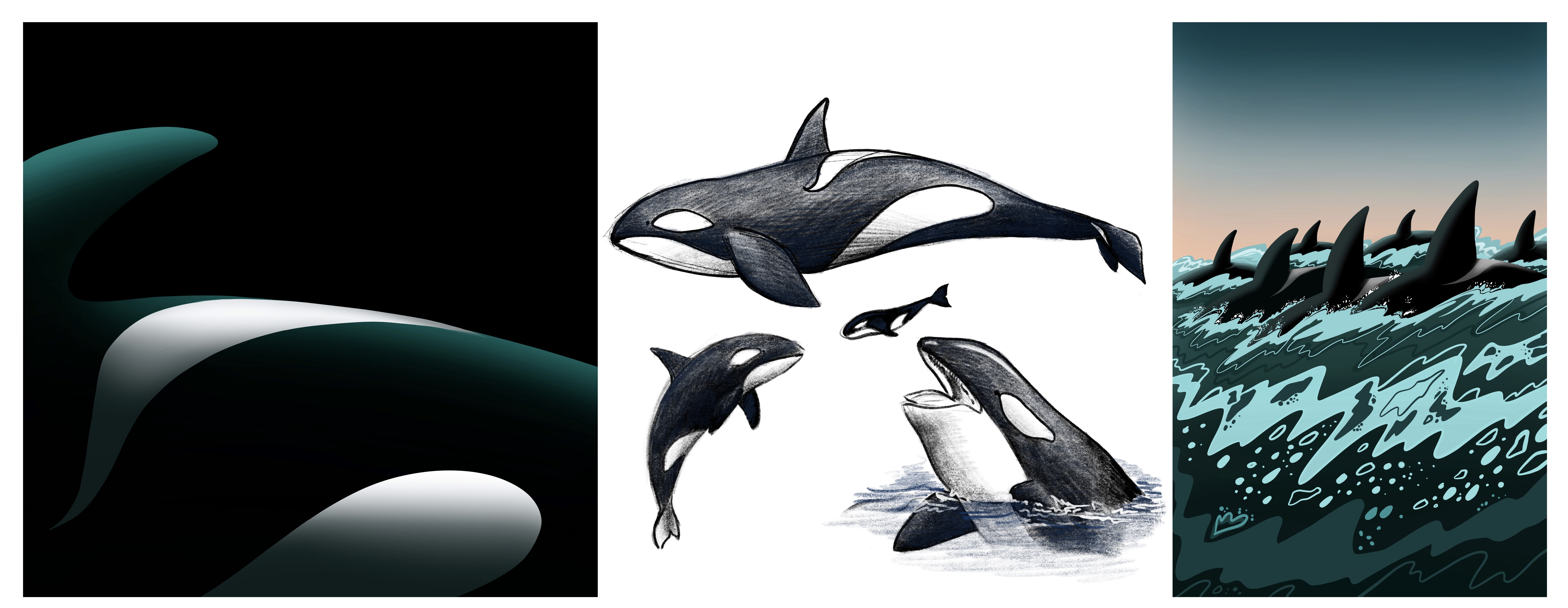 När jag sökte in till Grafisk Design på Malmö Universitet sökte jag in med arbetsprov. Uppgiften var att skapa ett designförslag utifrån ordet GRUPPER. Jag hade nyligen sett en dokumentär om späckhuggare, hur de lever i flockar och hur varje flock utvecklar egna språk och en egen kultur. Dokumentären visade även den plåga och psykiska ohälsa som dessa djur får utstå när människor fångar in dem och använder dem som underhållning i nöjesparker. Detta fick bli min inspiration till att designa ett bokomslag till en tänkt bok som handlar om späckhuggaren Tilikum och hans liv.